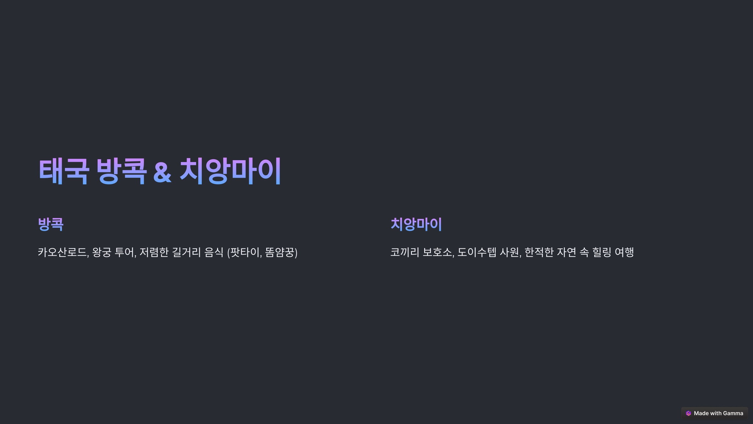 방콕은 쇼핑과 야시장 투어, 치앙마이는 힐링과 자연을 즐기기 좋은 도시예요.