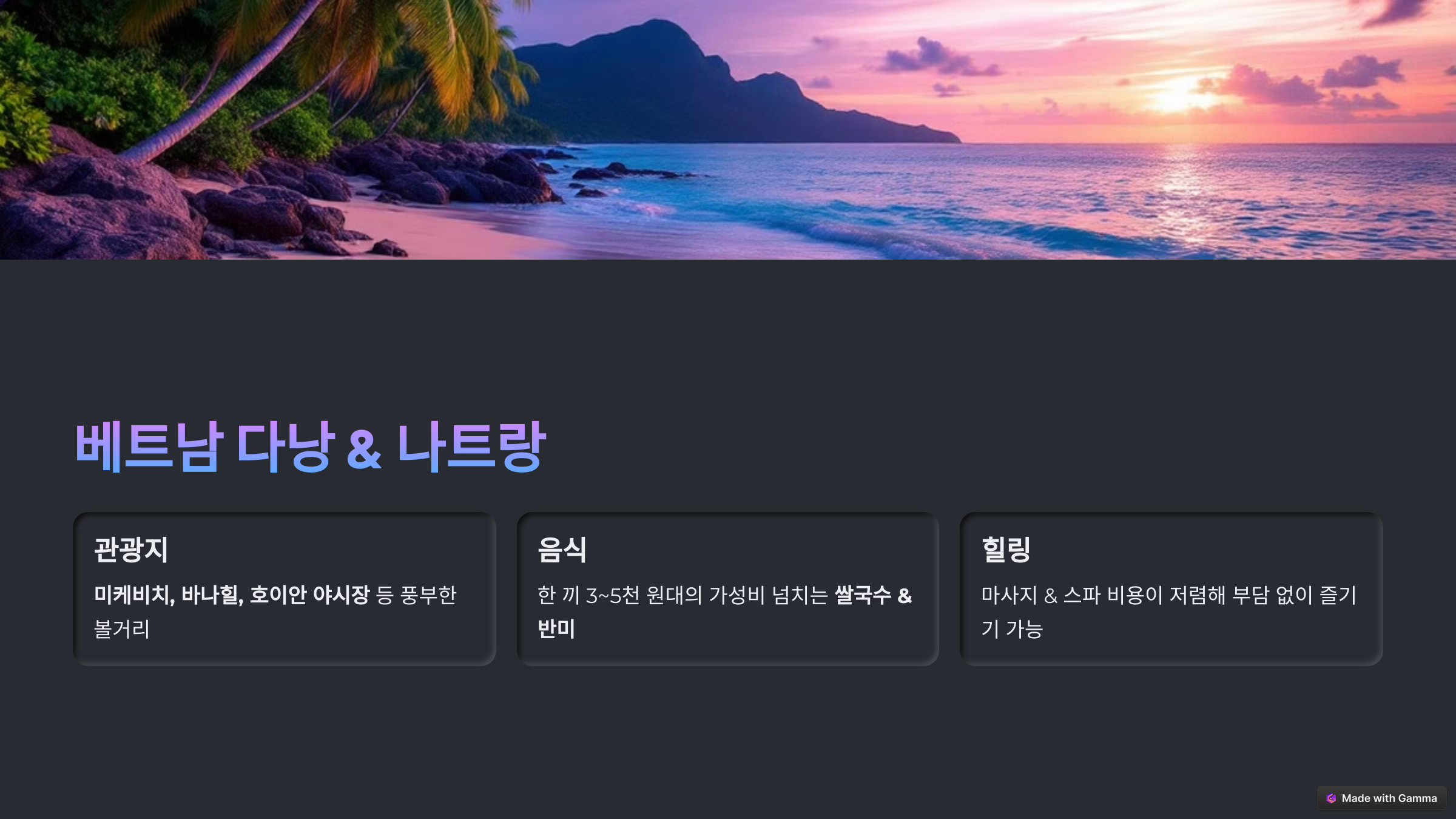✅ 미케비치, 바나힐, 호이안 야시장 등 관광지 풍부