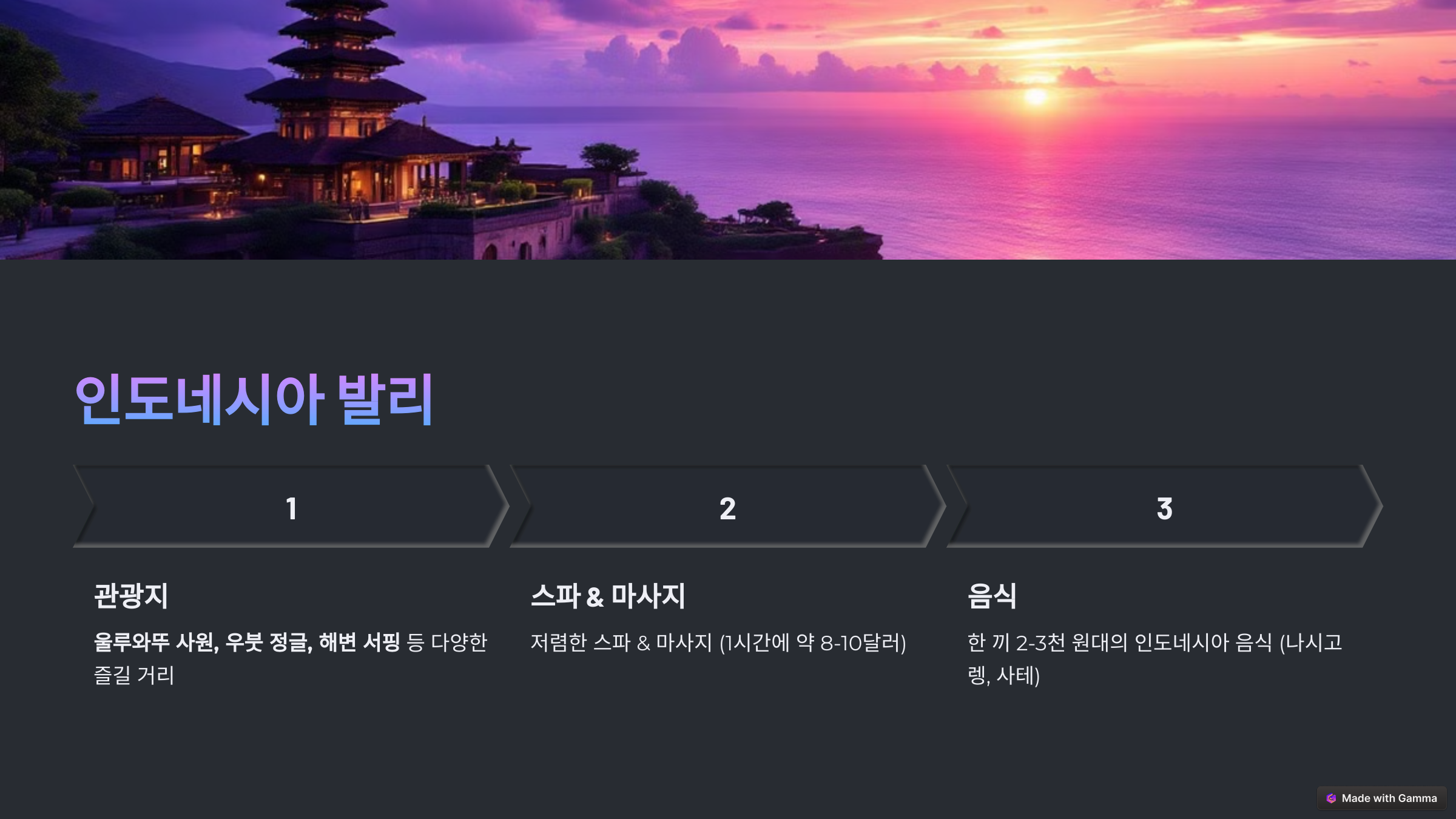발리는 아름다운 자연과 저렴한 물가 덕분에 여행하기 좋은 곳이에요.